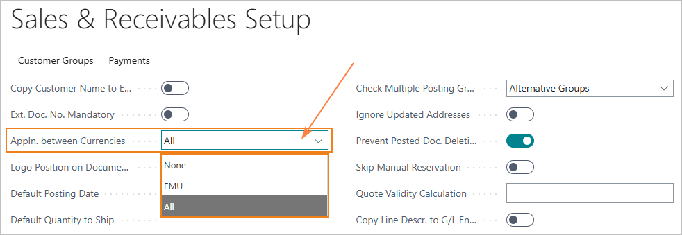 In the Currency Application field, the option All must be selected to enable compensation between EUR and all foreign currencies (EU and non‑EU). Alternatively, select EU to enable compensation only between EUR and EU currencies other than EUR.