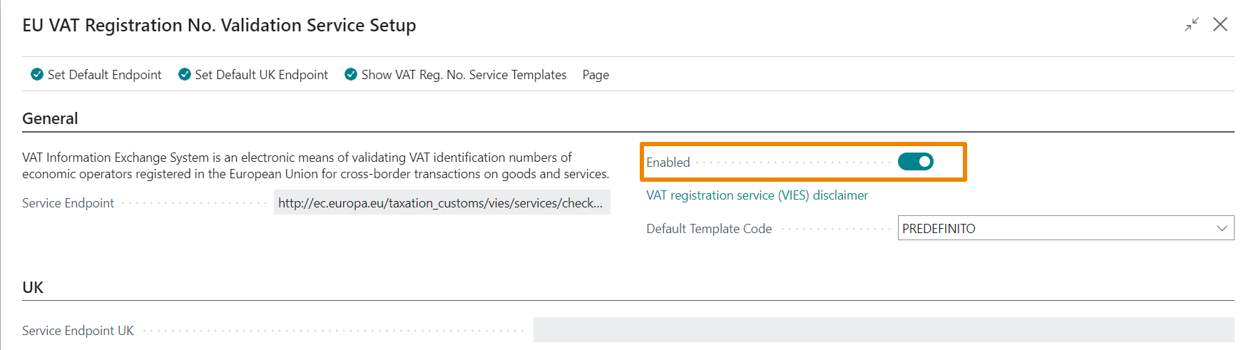 In “EU VAT Reg. No. Validation Service Setup” there is the URL for check (added by default with an address through code). Activate flag “Enabled”: