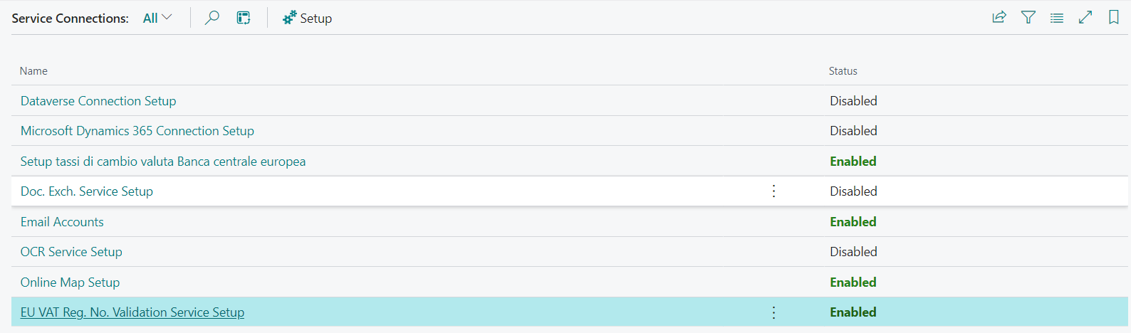 In “Service connections” select “EU VAT Reg. No. Validation Service Setup”.