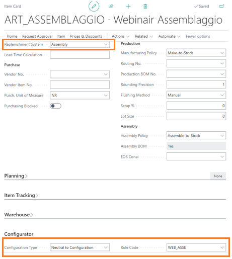 To configure an item with Assembly BOM it is necessary to set it up as: