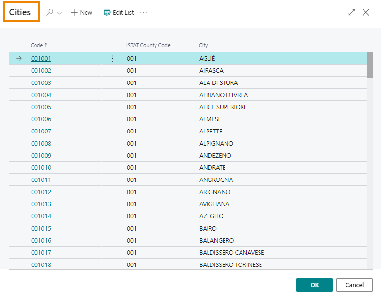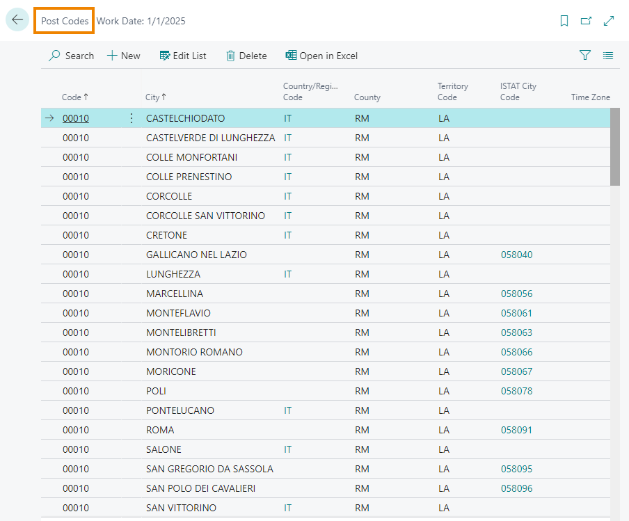 On the relative pages, the postal codes, provinces and cities must be specified in order to subsequently compose the addresses correctly: