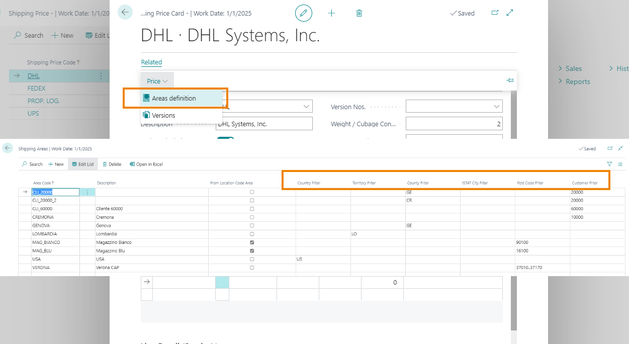 In the Shipping Price card from Related-> Price-> Areas definition it is possible to set the departure and shipping areas related to the shipping price list for all the routes agreed with the shipper.