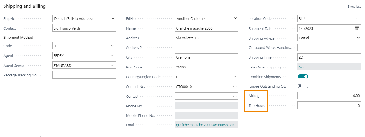 In the Shipping and Billing Tab you can enter the travel hours and the mileage. These quantities are considered by the system when it calculates the hours and miles/Km, based on what is indicated on the price lists.