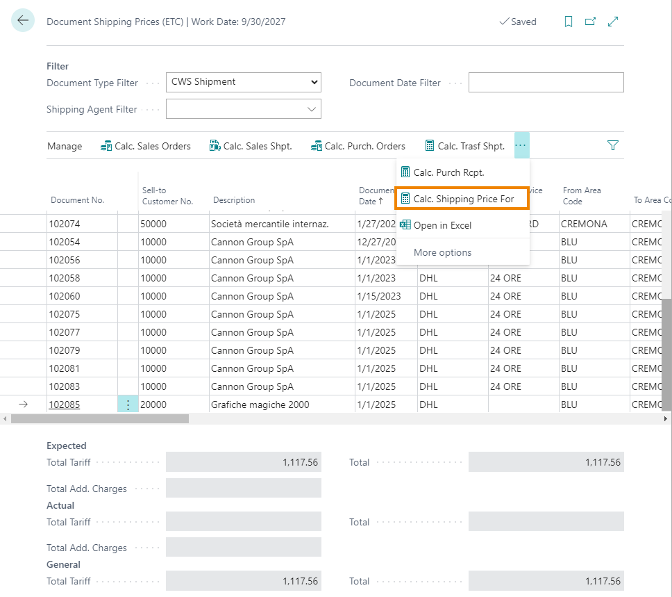 If you want to calculate transport costs based on CWS, on the Document Shipping Price (ETC) page you use the “Calc. Shipping Price For” function: