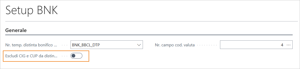 E’ possibile escludere la compilazione di CIG e CUP nelle righe della distinta fornitore abilitando il campo “Escludi CIG e CUP da distinta fornitore” nel Setup BNK.