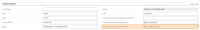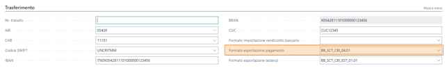Nella cartella" Trasferimento" della scheda conto corrente bancario dovrà essere impostato nel campo “Formato esportazione pagamento” il nuovo formato.