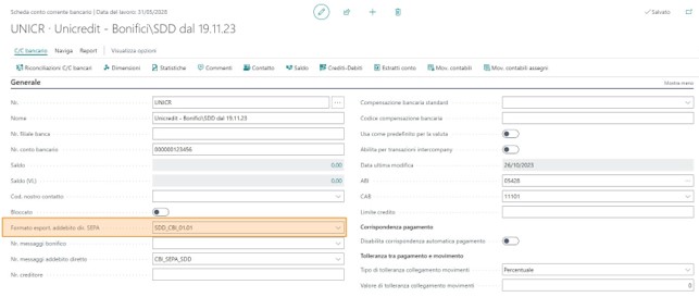 Nella cartella “Generale” della scheda conto corrente bancario impostare nel campo “Formato esportaz. addebito dir. SEPA” il codice creato allo scopo.
