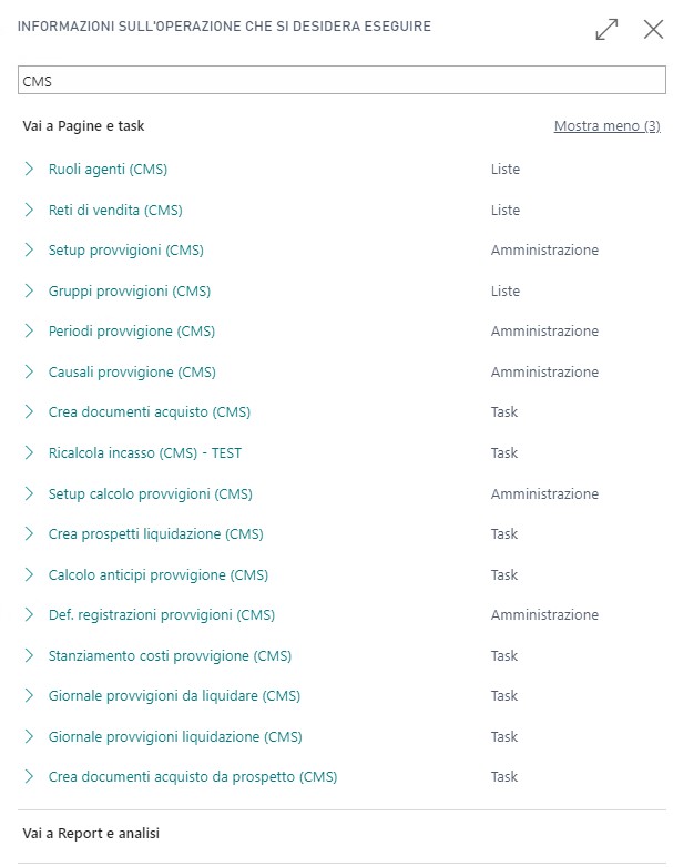 | Effettuare il setup agenti: Ruoli agenti (CMS), Rete di vendita (CMS), Gruppi provvigioni (CMS) | Setup agenti |