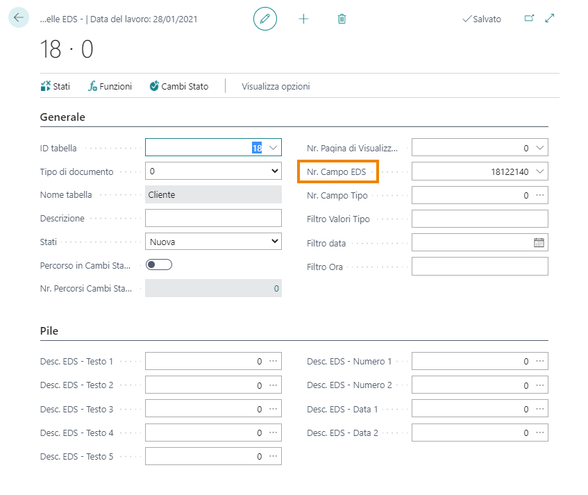 In “Nr Campo EDS” il sistema riporta in automatico il numero del campo in cui verrà indicato lo stato Data Security (sulla page Clienti nell’esempio sopra riportato).