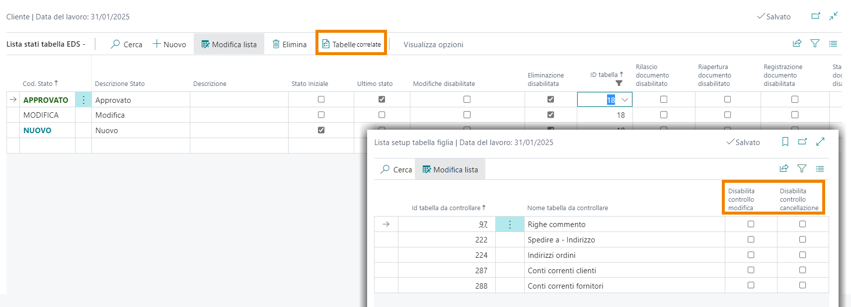 Da Tabelle correlate si stabilisce, per ogni stato, se le tabelle ad esso collegate possono essere modificate: