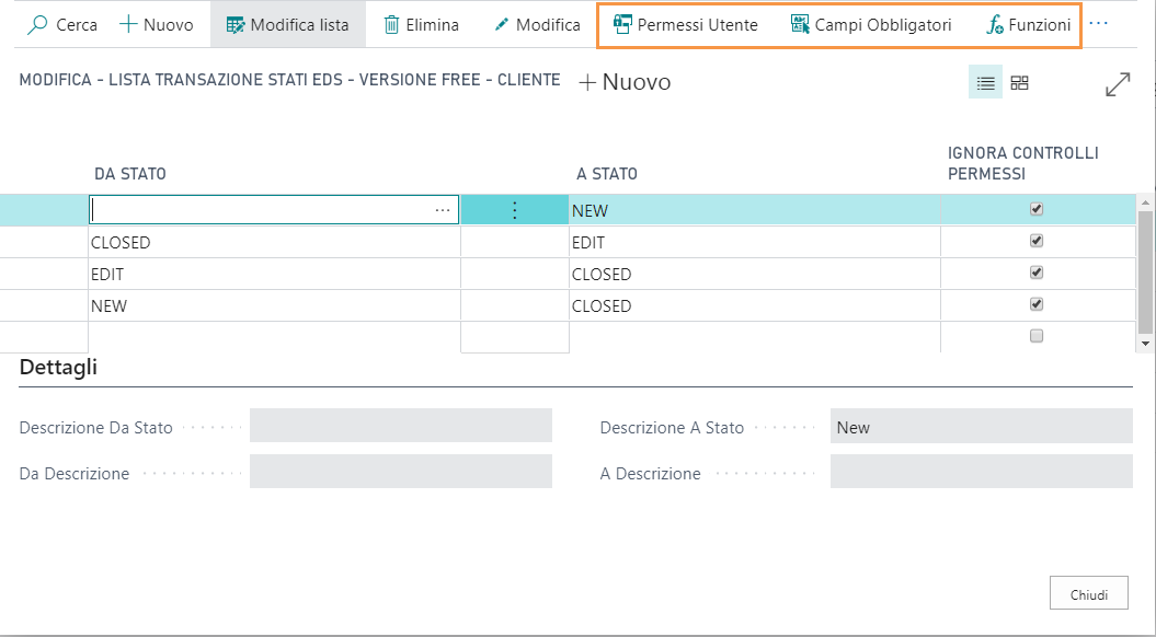 E’ possibile impostare i cambi stato cliccando su Cambi di Stato; posso ad esempio definire da Edit a Closed e le azioni da fare prima di passare da uno stato all’altro.