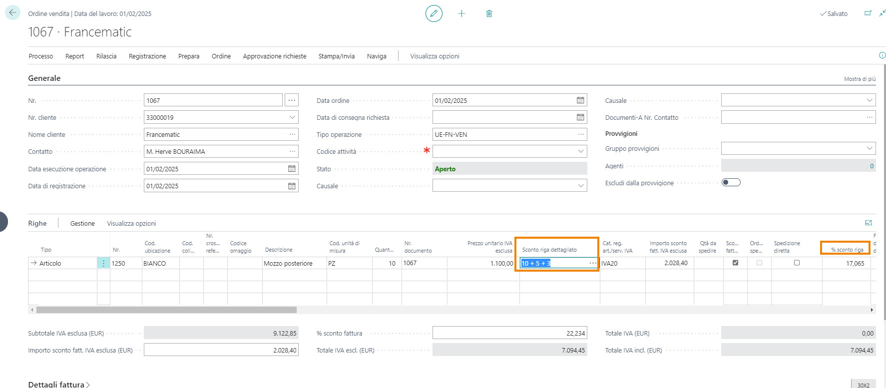 Chiudendo la tabella di dettaglio e tornando sul documento il sistema avrà aggiunto gli sconti inseriti dalla pagina di dettaglio: