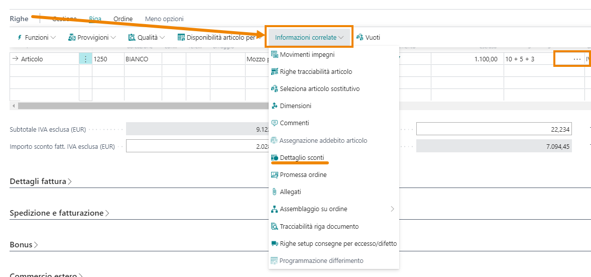 In aggiunta al campo standard “%sconto riga”, sulle righe è presente il campo “Sconto riga dettagliato” in cui è possibile inserire sconti multipli. Da Righe->Informazioni correlate->Dettaglio sconti oppure dai tre puntini