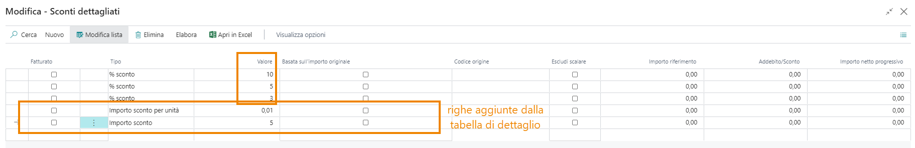 è possibile accedere alla tabella di dettaglio nella quale si possono visualizzare gli sconti inseriti. E’ possibile inoltre aggiungere righe di sconto: