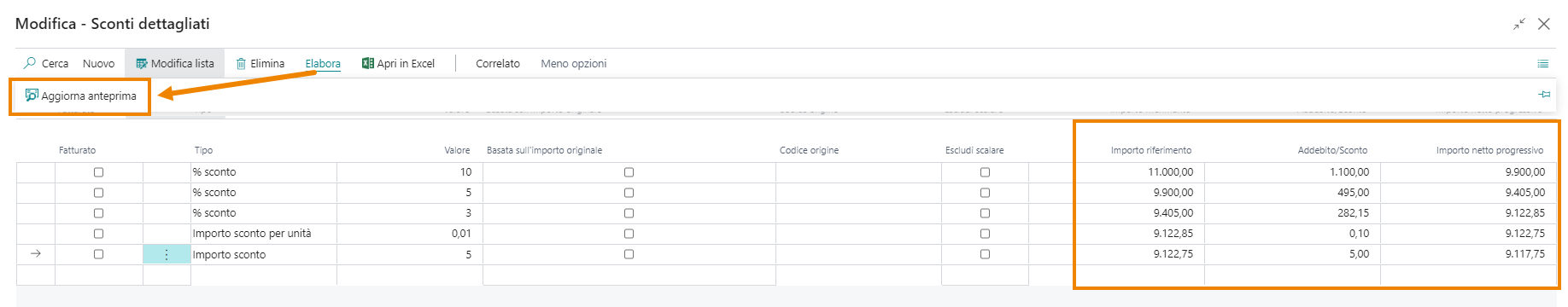 | Elabora->Aggiorna anteprima | Consente di far popolare al sistema i campi Importo riferimento-Addebito/Sconto-Importo netto progressivo per vedere gli importi sconto in anteprima. Va eseguita ad ogni modifica.![]() |