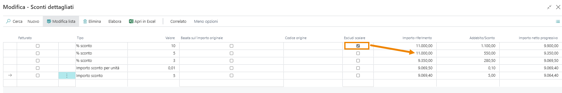 | Escludi scalare | Il sistema di default calcola gli sconti in modo scalare sull’importo che via via si riduce man mano che gli sconti vengono aggiunti. Abilitando questa opzione invece gli sconti ripartono dall’importo originale del documento:![]() |