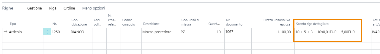 il sistema ha suddiviso gli sconti inseriti nella riga del documento creando tre righe di dettaglio. Le ultime due righe sono state aggiunte manualmente.