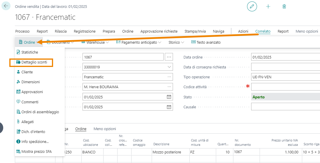 E’ possibile anche applicare sconti documento da Correlato->Ordine->Dettaglio sconti: