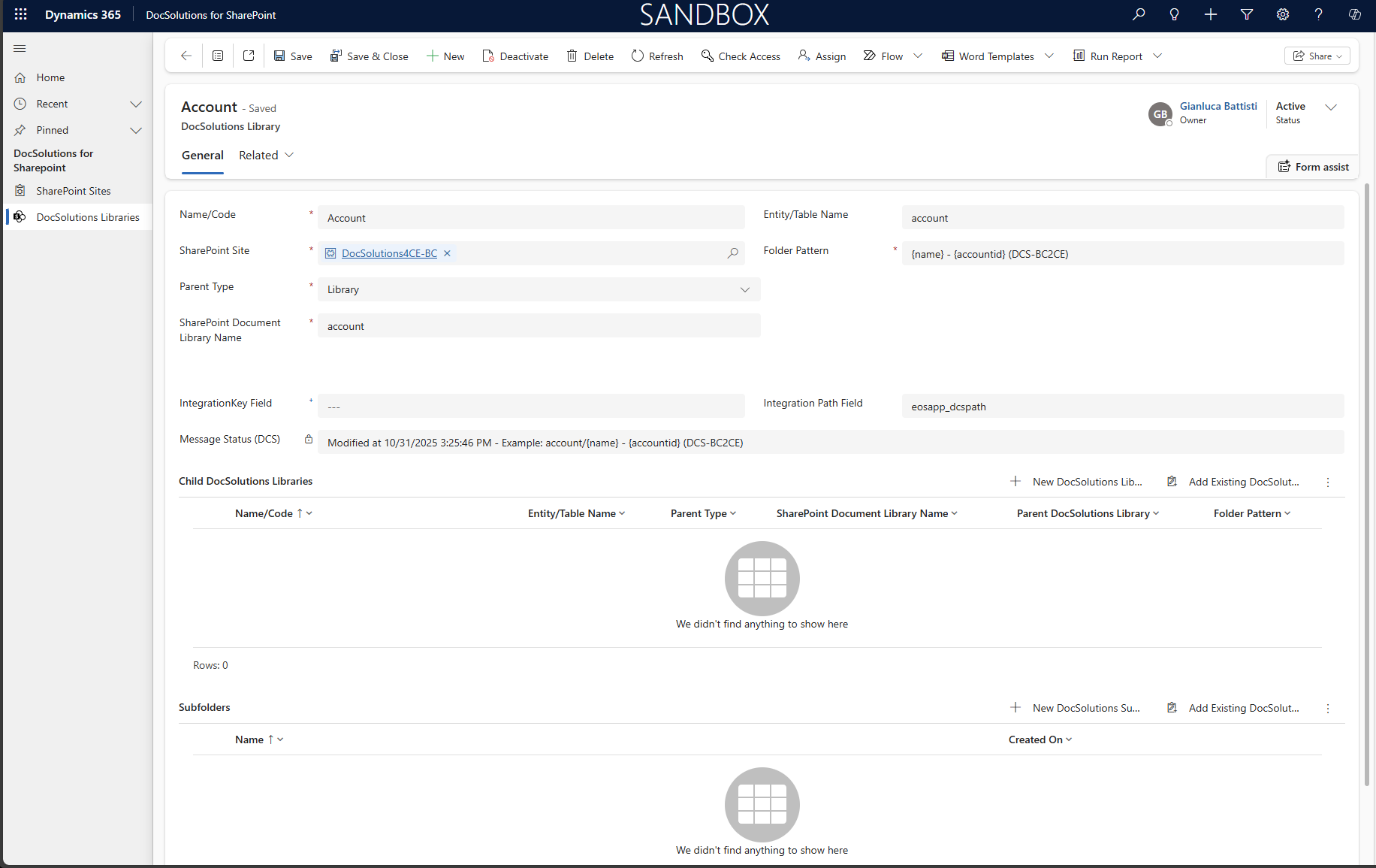 - Dalla pagina DocSolution SharePoint Setup, impostare Tenant ID, Client ID e Client Secret (gli stessi usati in CE).
