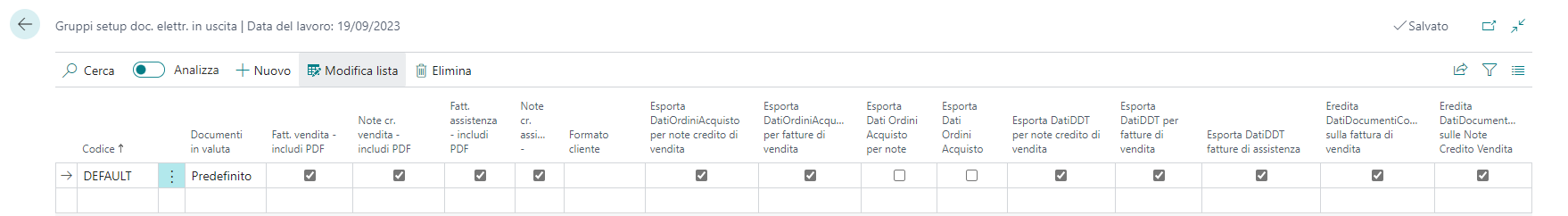 Tali impostazioni riguardano inclusione o l’esclusione dell’allegato pdf della fattura/nota credito, l’esportazione di dati Documento di trasporto, altri dati correlati, ecc.
