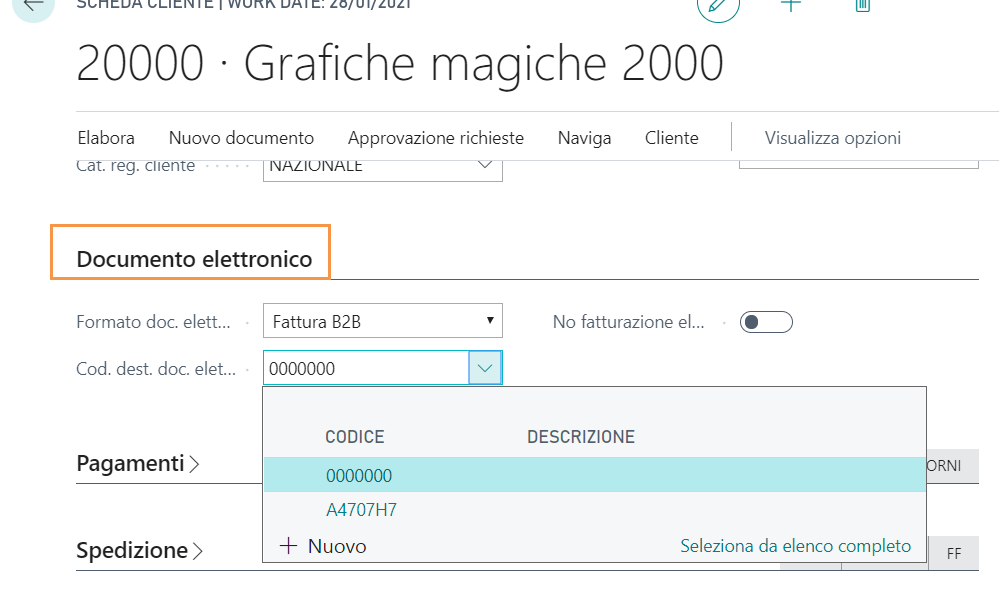 Nella scheda cliente, sotto il Tab Documento elettronico, compilare i seguenti campi: