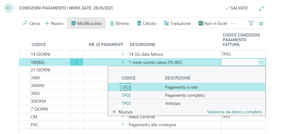 In Condizioni pagamento compilare il campo Cod. condizioni pagamento fattura inserire uno dei codici stabiliti dall’Agenzia delle Entrate: