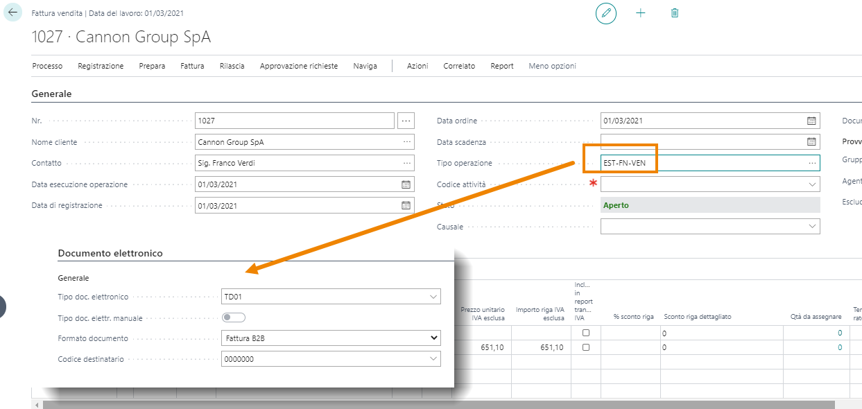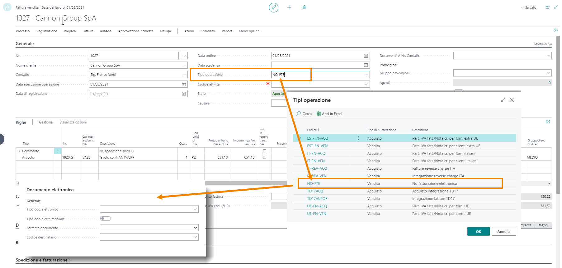 3. Al momento della creazione di un documento vendita per un Cliente avente dati della Fatturazione Elettronica compilati in anagrafica, scegliendo il Tipo operazione NO-FTE nel caso di esempio, il sistema non compilerà i campi relativi alla fattura elettronica: