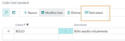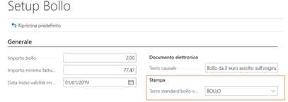 | Doc. Elettr. testo causale | Testo che comparirà sulla stampa della fattura nel caso il bollo venga pagato dall’azienda |
