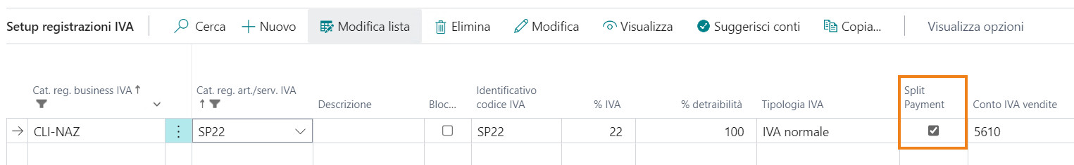 Nella pagina “Setup registrazioni IVA” occorre creare gli opportuni record con flag “Split Payment” valorizzato a Sì:
