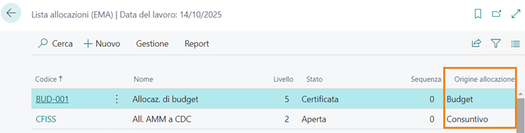 Nelle page “Lista allocazioni” e “Scheda allocazione” è presente il campo “Origine allocazione”, contenente le seguenti opzioni: