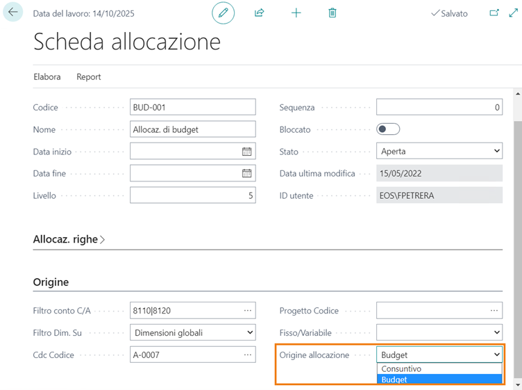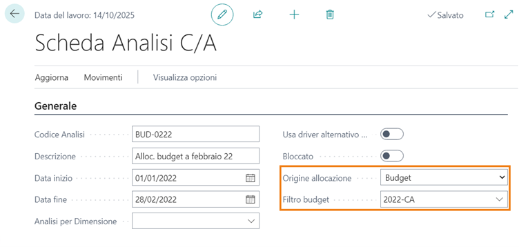 | Filtro budget | Valorizzabile, se il campo precedente presenta l’opzione Budget, per indicare il periodo di budget dal quale recuperare i dati oggetto di allocazione. |
