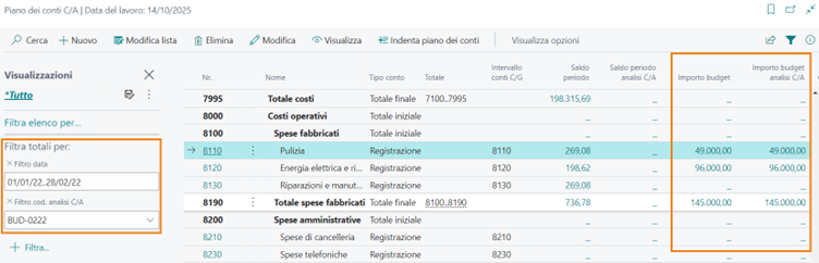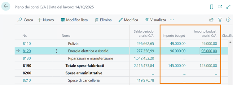 | Importo budget | Valore calcolato in funzione dei dati presenti nel Budget C/A per lo specifico conto |