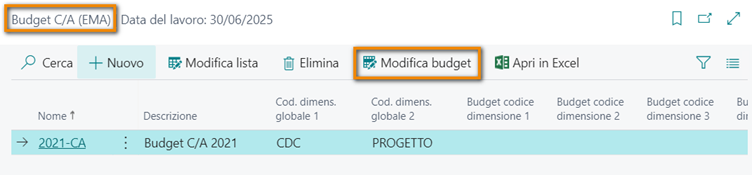 Attraverso questa pagina è possibile gestire il Budget C/A per Periodo e Dimensioni, definendo quattro dimensioni per ogni budget, oltre alle 2 globali.