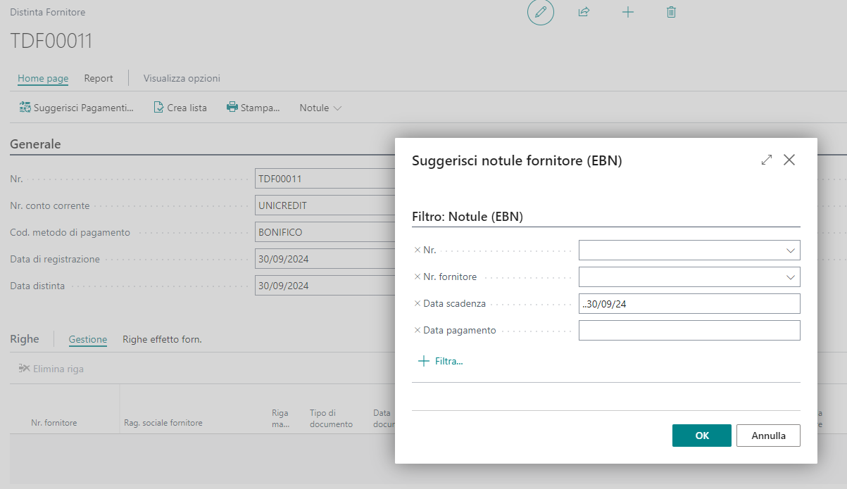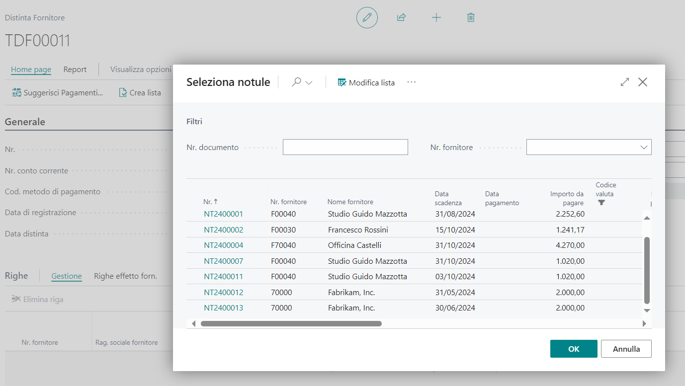 In questo caso la lista è già prefiltrata e mostra, quindi, solo le Notule rilasciate che non presentano il campo In sospeso compilato e nella stessa valuta della distinta.