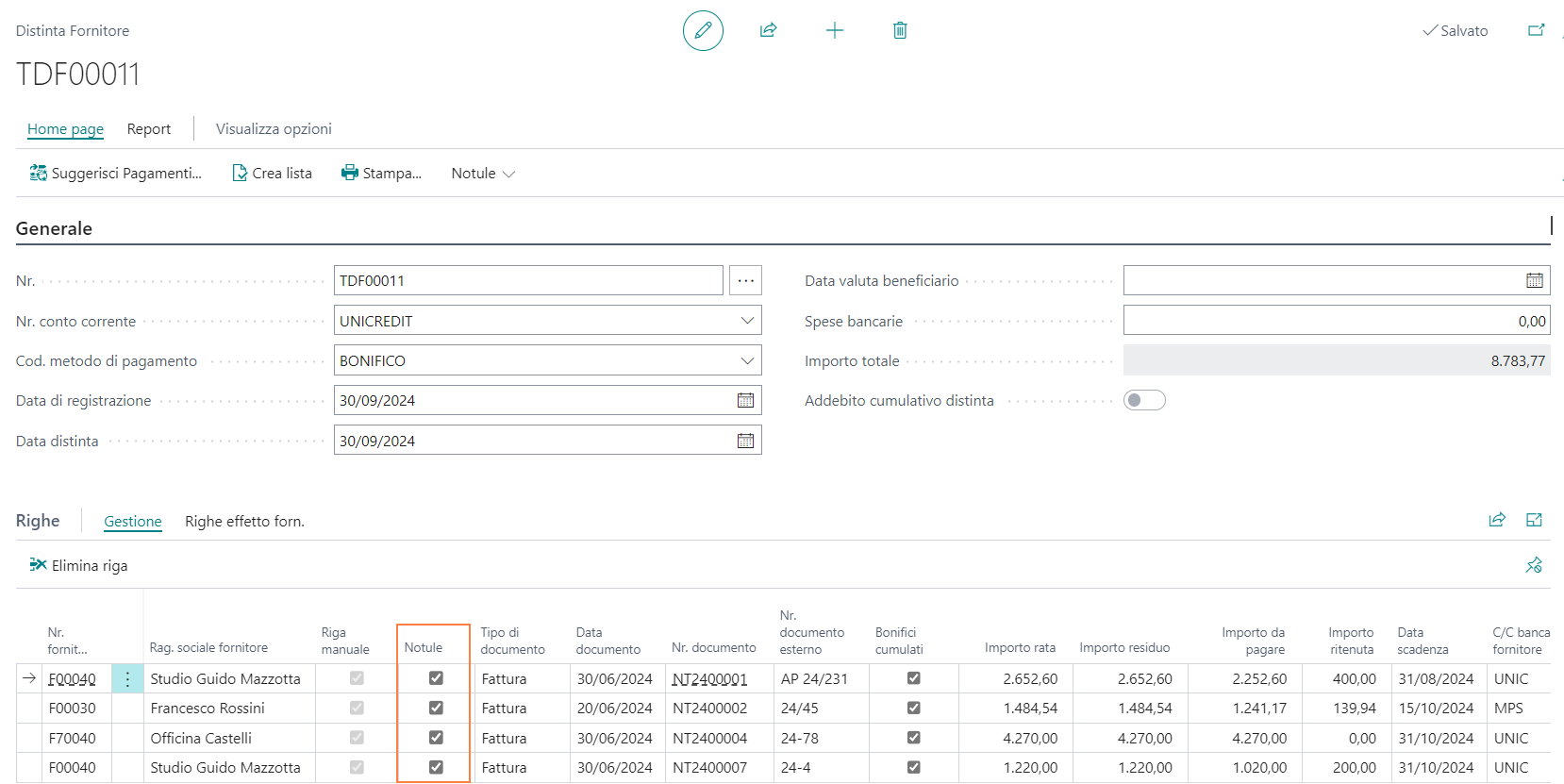 Una volta effettuata la selezione, le Notule verranno riportate nelle righe della distinta. Il “Tipo documento” proposto sarà “Fattura”, il “Nr. documento” sarà quello della Notula e la riga della distinta presenterà il campo “Notule” impostato a “Sì”.