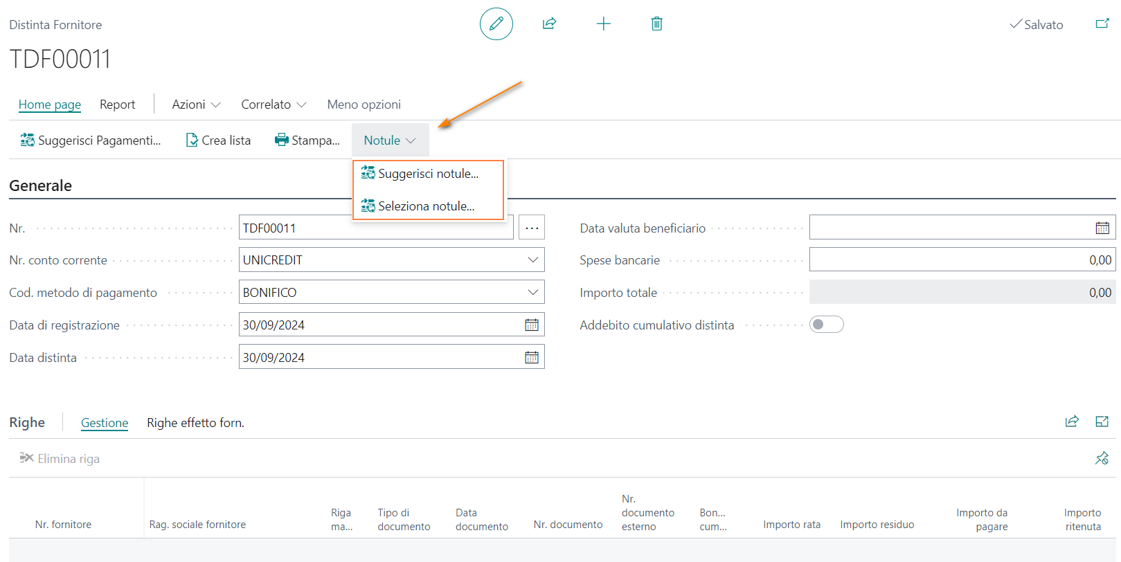 Nella Distinta fornitore, per il pagamento delle notule, sono presenti due azioni: Suggerisci notule e Seleziona notule.
