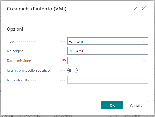 | Data emissione | nelle dichiarazioni d’intento emesse verso i fornitori, indica appunto la data di emissione della dichiarazione. Nelle dichiarazioni d’intento ricevute dai clienti, il campo viene comunque proposto in fase di creazione ma, concettualmente, indica la data di generazione del record nella tabella. |