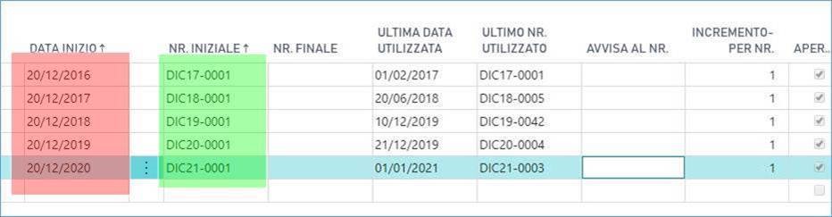 È importante effetuare un corretto setup nella page Nr Serie: va impostato già a fine dicembre dell’anno in corso il numeratore dell’anno successivo (vedere immagine di esempio)