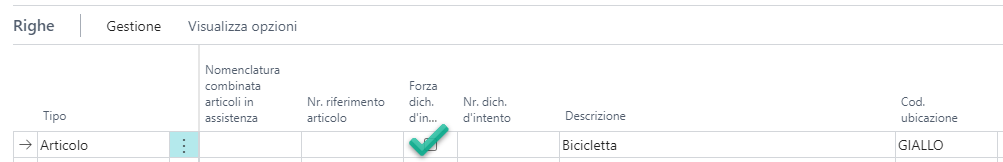 L’opzione “Forza dich. Intento” presente sulle righe viene barrata in automatico dal sistema ogni volta che i dati della DI sulla fattura non corrispondono ai dati della DI sulla spedizione / carico originari: ![]() |