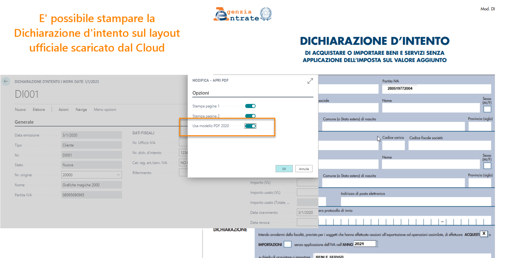 È possibile stampare la Dichiarazione d’intento sul layout ufficiale scaricato dal Cloud. Dalla pagina della DI premendo Azioni->Stampa / Apri PDF:
