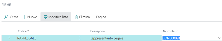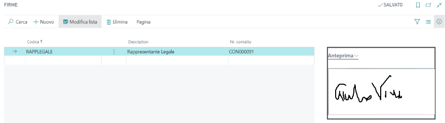 Si apre la pagina con l’elenco delle firme presenti. Con Nuovo si può aggiungere una nuova firma; inserire il codice, la descrizione e, se codificato, il contatto corrispondente