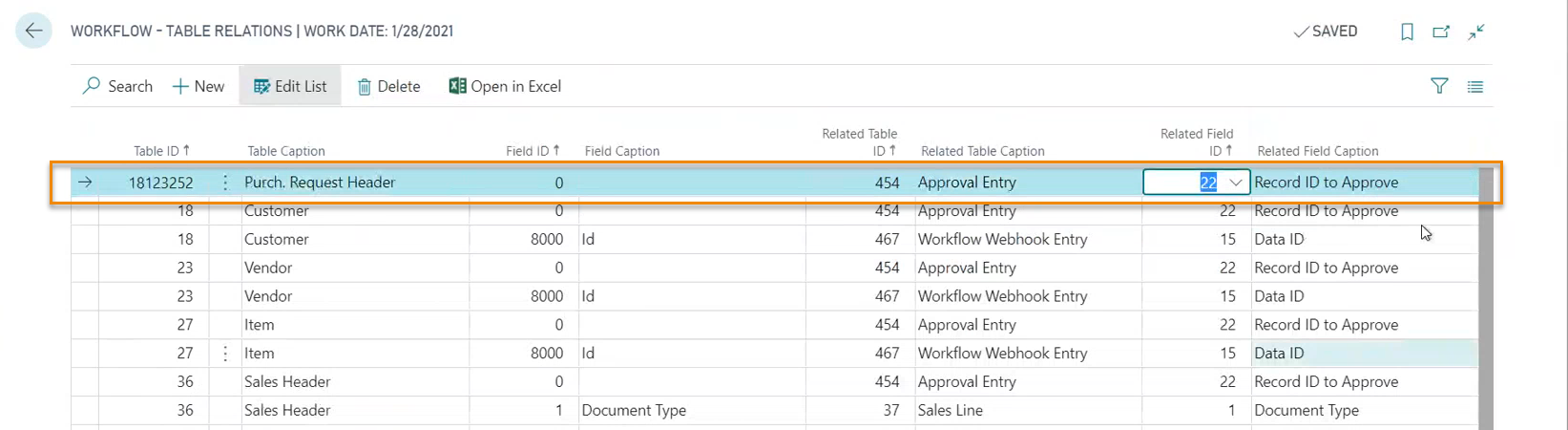 - Cercare con ALT+Q “Workflow - Relazioni tabella”. Aggiungere un record come indicato per tabella 18123252: