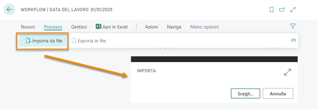 All’interno di Business Central con ALT+Q cercare “Workflow” e selezionare Processo->Importa da file e scegliere il file scaricato: