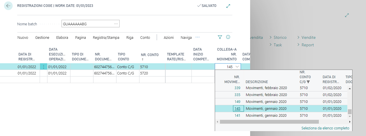 Nella page Registrazioni COGE è possibile scegliere i movimenti da collegare: