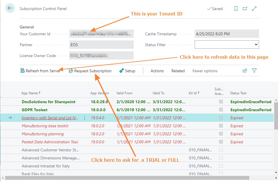 I prezzi sono elencati sul sito di EOS Solutions. Tutti i prezzi sono destinati a un tenant con ambiente illimitato, company e utenti illimitati all’interno di un TenantID. L’ID tenant viene visualizzato nella pagina “Pannello di controllo sottoscrizioni” di Business Central.