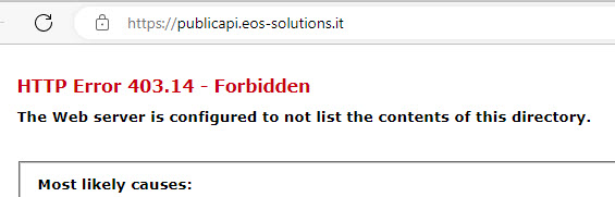 - Verifica l’utente di servizio di BC raggiunga https://publicapi.eos-solutions.it/ : la risposta attesa tramite browser è 403, in caso di errore 404 significa che il server non riesce a raggiungere questo indirizzo. Verificate firewall e connessione