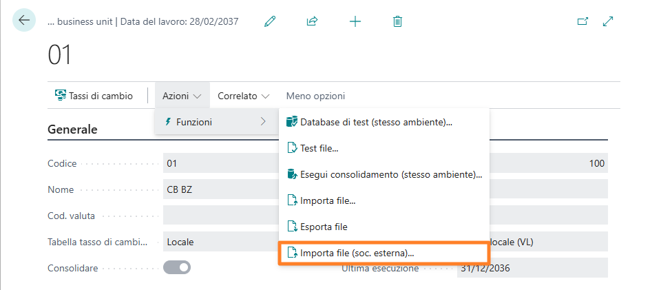 Nella scheda della Business Unit è presente la possibilità di importare, con le stesse logiche standard, i saldi relativi a società esterne a BC, grazie alla compilazione dello specifico tracciato Excel: