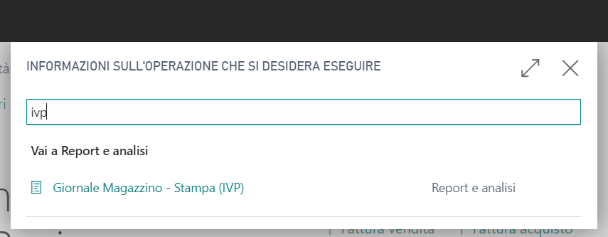 | 1 | Cercare con ALT + Q "Giornale Magazzino - Stampa (IVP)" |