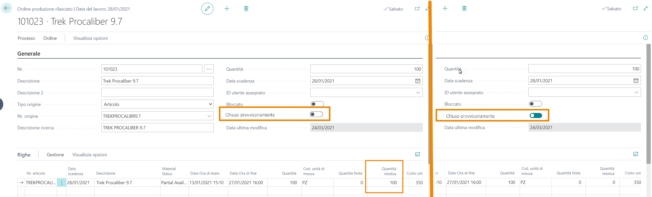 Riattivando l’opzione Chiuso provvisoriamente la Quantità residua viene ripristinata.