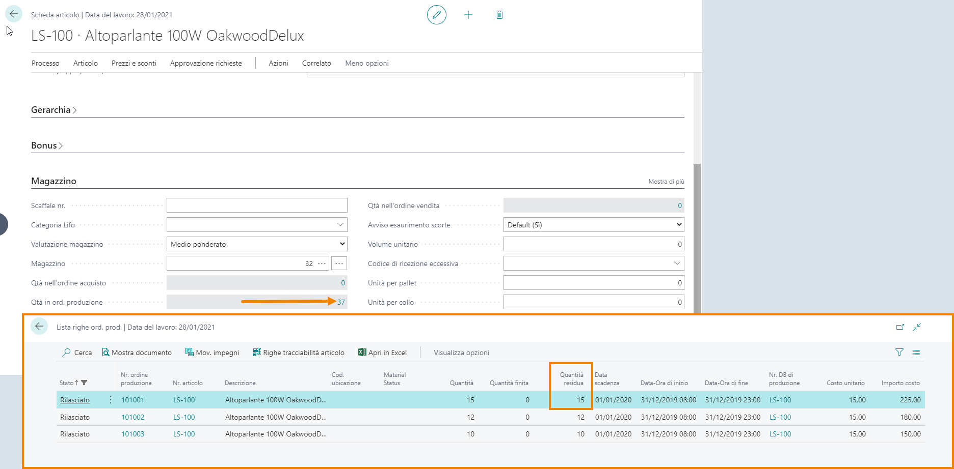 Anche in anagrafica articolo viene aggiornata la “Qtà in ord. produzione”. Infatti, essendo il flag Chiuso provvisoriamente attivo, la Qtà residua risulta essere 0: